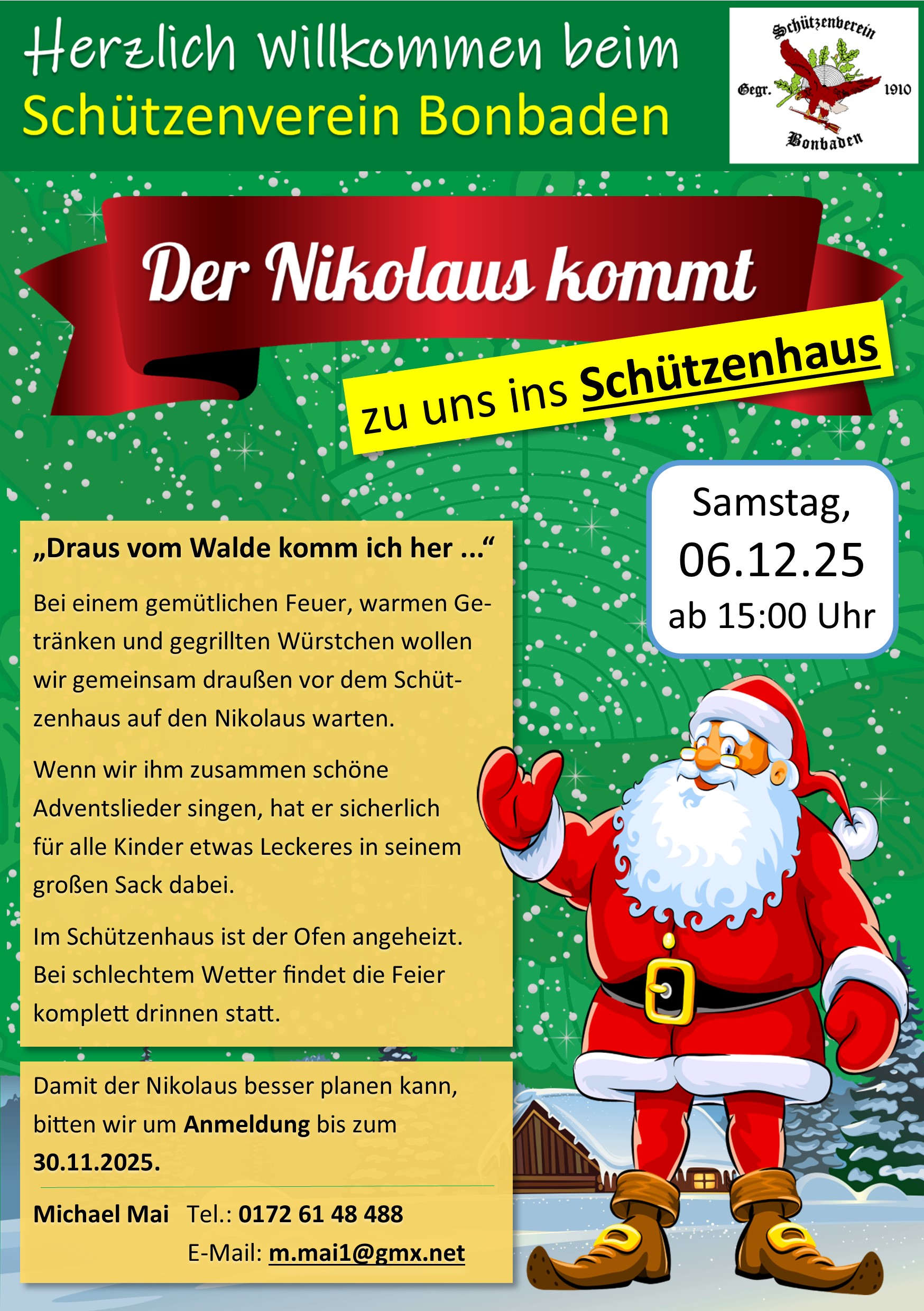 Bei einem gemütlichen Feuer, warmen Getränken und gegrillten Würstchen wollen wir gemeinsam draußen vor dem Schützenhaus auf den Nikolaus warten.
