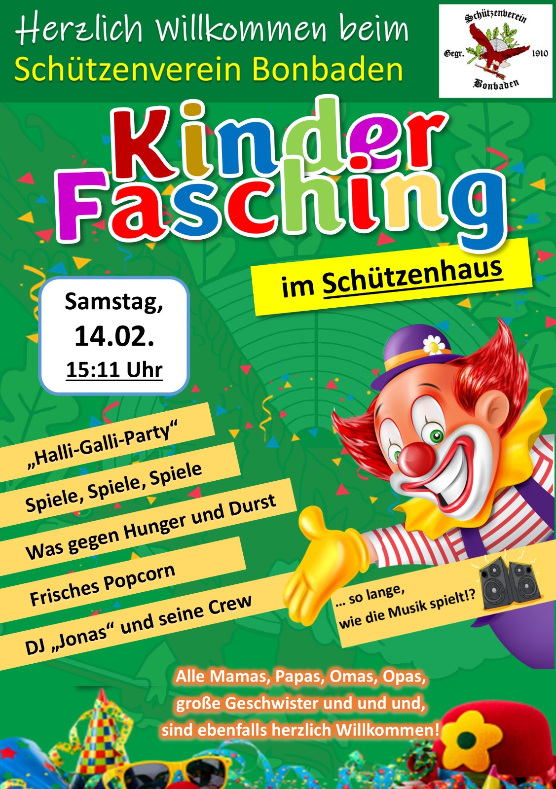Der Startschuss fällt am 14.02.2026 um 15.11 Uhr. Um den kleinen Hunger und den großen Durst muss sich keiner sorgen. Für die Stimmung ist ebenfalls bestens gesorgt, die spielend das Schützenhaus in eine Partyzone verwandeln. Zum Ausklang der Veranstaltung dürfen Eltern und alle anderen Faschingsfreunde gerne bleiben und weiter feiern.