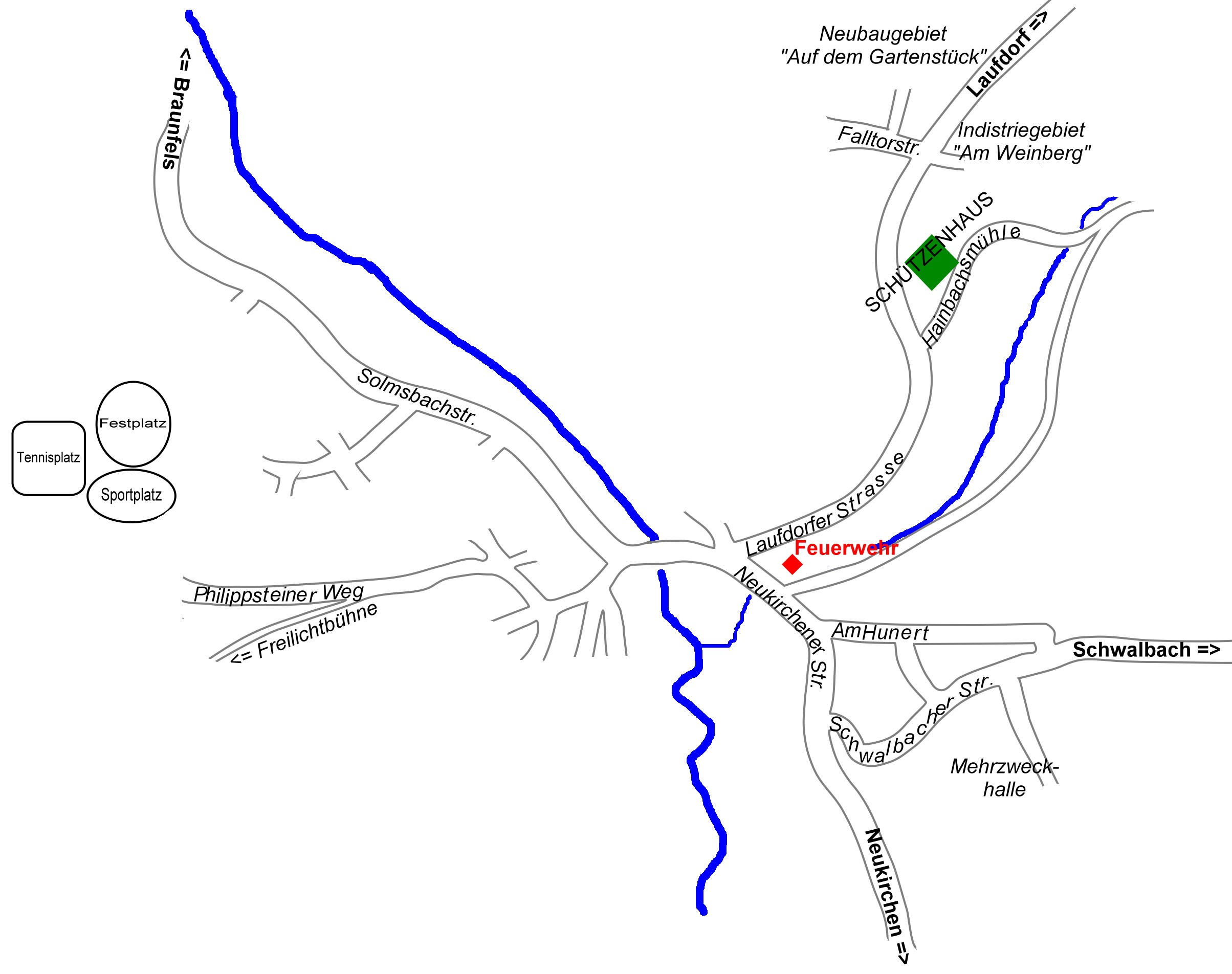 Nach dem Ortseingang der Hauptstraße bis zur abknickenden Vorfahrtstraße folgen. Hier rechts abbiegen in die Laufdorfer Straße in Richtung Laufdorf/Wetzlar. An der nächsten Straße rechts abbiegen. Das erste Haus auf der linken Seite ist das Schützenhaus.